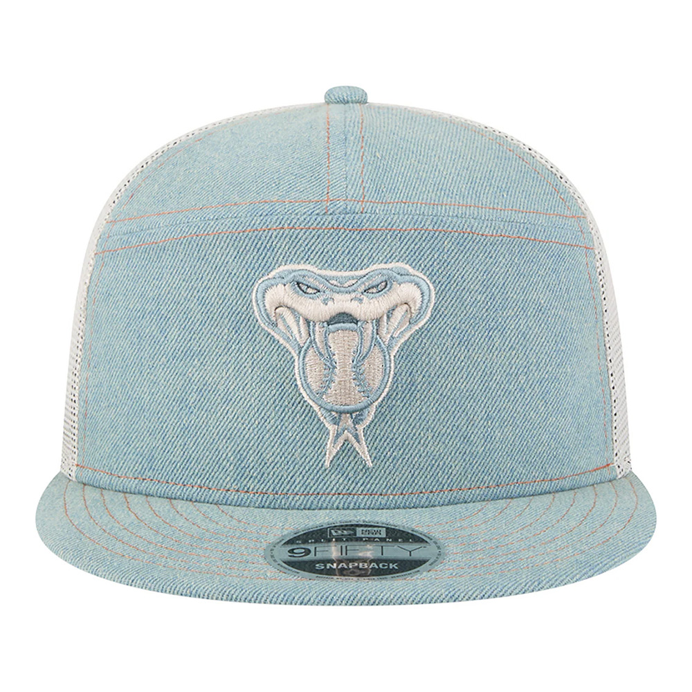 Rep your Arizona Diamondbacks in classic style with this Denim Split Panel 9FIFTY Snapback Trucker Hat from New Era. It features breathable mesh on the mid and rear panels, while the front section boasts contrast stitching and a unique split triple-panel design for a touch of extra style. With its high crown and structured fit, this hat offers a modern and comfortable feel, perfect to pair with your favorite jeans when cheering on the Arizona Diamondbacks at the stadium.