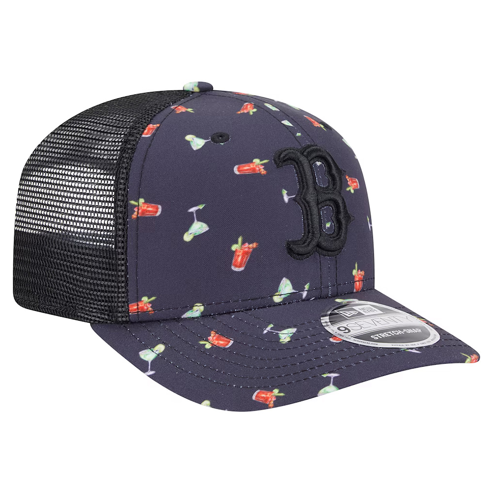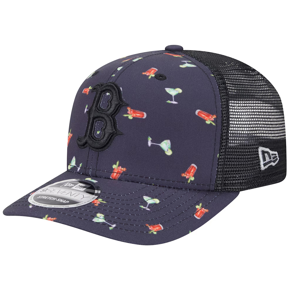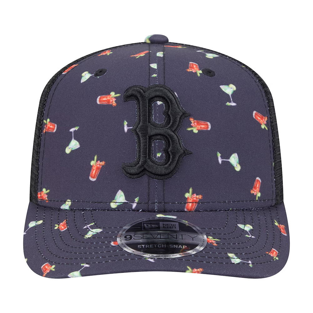 It is five oclock somewhere so spice up your Boston Red Sox attire with this New Era Adventure Drinks Pattern 9SEVENTY Stretch-Snap Hat. This trucker cap features a playful, sublimated drink pattern on the front panels and bill, adding a touch of personality to your game day outfit. The Boston Red Sox logo is prominently embroidered at the front.