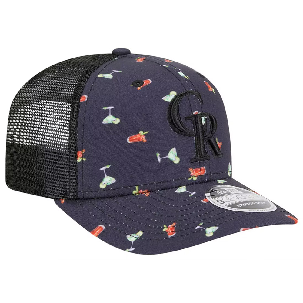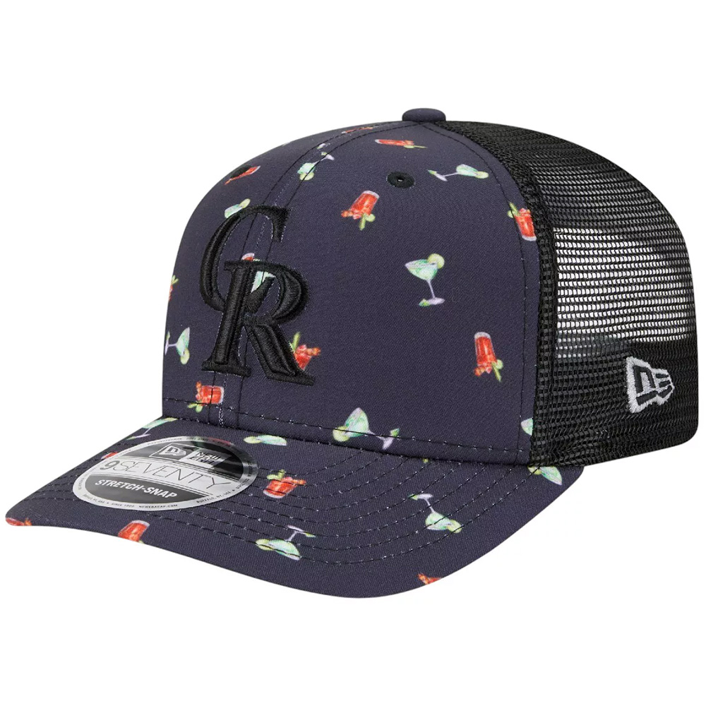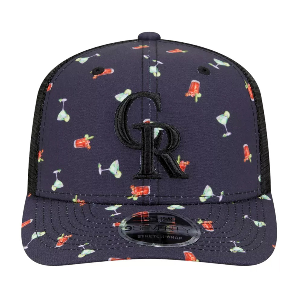 It is five oclock somewhere so spice up your Colorado Rockies attire with this New Era Adventure Drinks Pattern 9SEVENTY Stretch-Snap Hat. This trucker cap features a playful, sublimated drink pattern on the front panels and bill, adding a touch of personality to your game day outfit. The Colorado Rockies logo is prominently embroidered at the front.