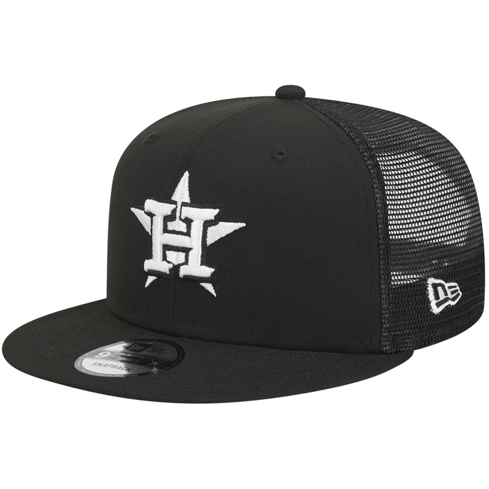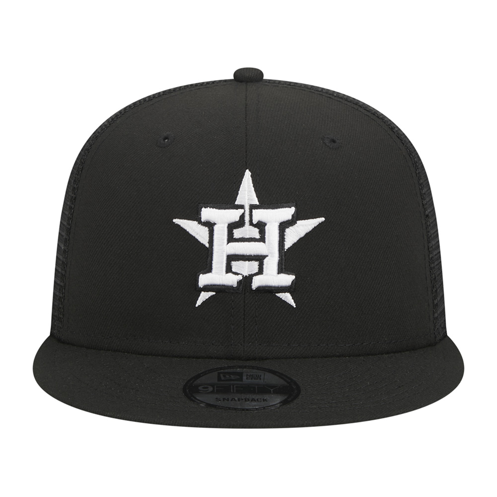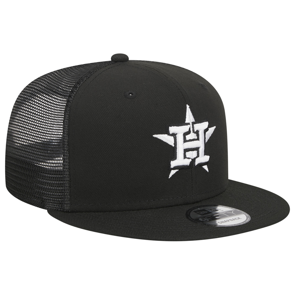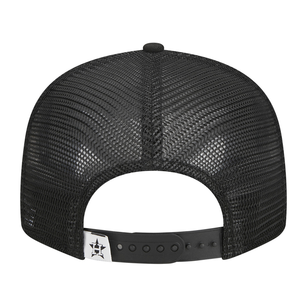 Put an elevated spin on your Houston Astros fandom with this New Era 9FIFTY trucker hat. It features vibrant Houston Astros embroidery on a solid black background to highlight your devotion loud and proud. The mesh panels provide breathability while the flat bill and high crown bring street-ready flair to your collection.