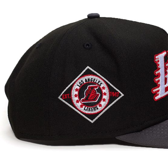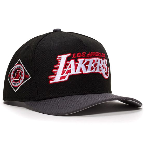 Rock this Los Angeles Lakers 9FIFTY A-Frame Adjustable Hat from New Era for a fresh take on classic team style. This Los Angeles Lakers hat boasts a structured fit and features a curved bill for a classic look. Its unique design includes raised LA Lakers embroidery on the front panels and 2tone black and grey colorway. Topped off with a commemorative 1947 Lakers side patch on the right-side crown, this hat is a must-have for any Yankees fan.