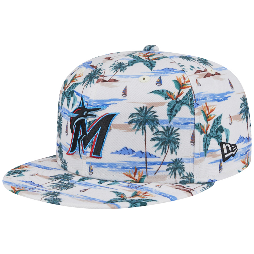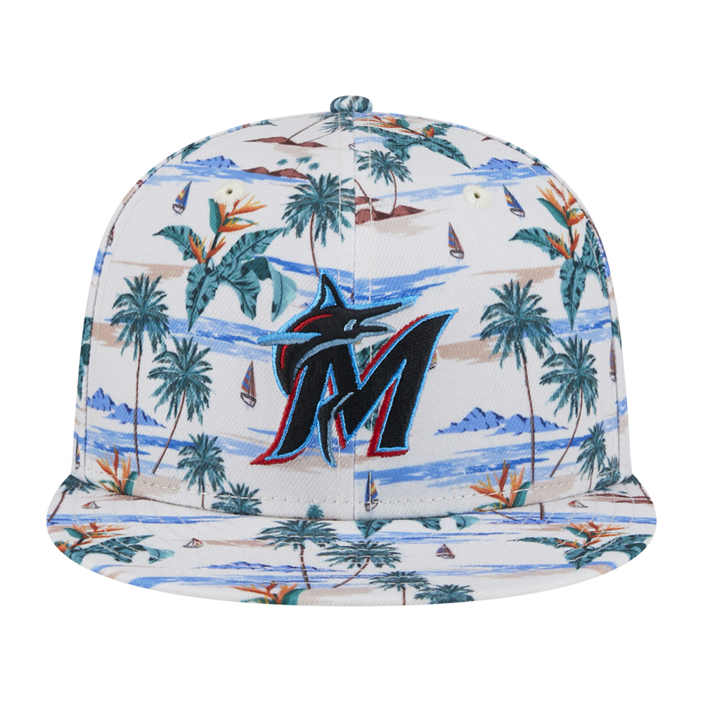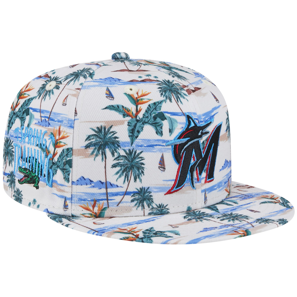 Sure, you have the regular cap to show off your allegiance to the Miami Marlins, but what you are really wanting to find is that truly unique cap that blows the others out of the water. This Spring Training 9FIFTY snapback Hat from New Era is that cap! It features a raised embroidered Miami Marlins logo with Florida palm trees background graphics as well as special Spring Training embroidered graphics on the side.