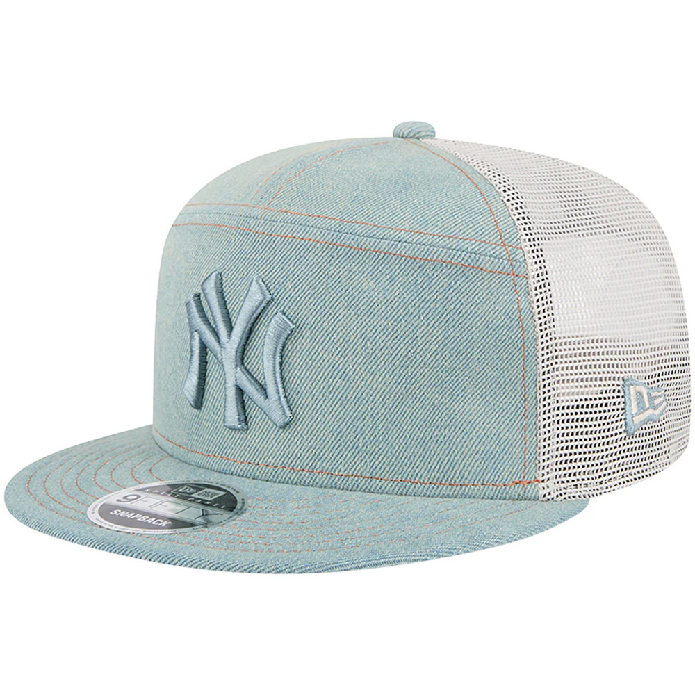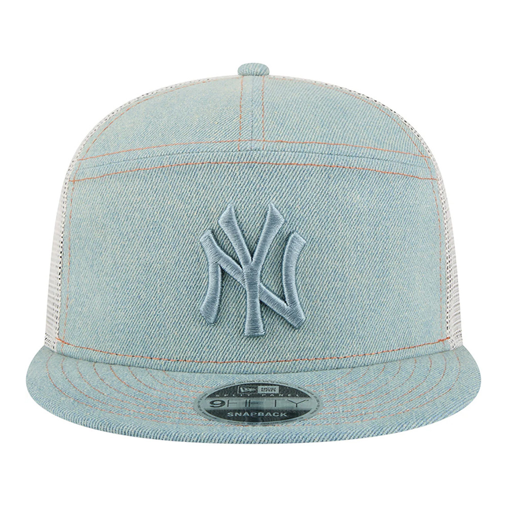 Rep your New York Yankees in classic style with this Denim Split Panel 9FIFTY Snapback Trucker Hat from New Era. It features breathable mesh on the mid and rear panels, while the front section boasts contrast stitching and a unique split triple-panel design for a touch of extra style. With its high crown and structured fit, this hat offers a modern and comfortable feel, perfect to pair with your favorite jeans when cheering on the New York Yankees at the stadium.